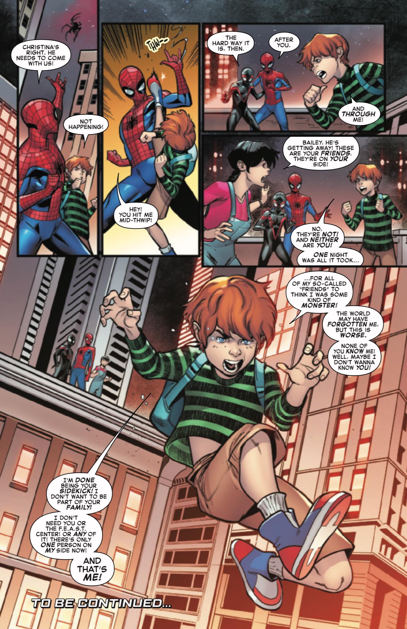 What about Bailey’s parents? The child is currently unhoused, living in the F.E.A.S.T. shelter. There has been speculation that Spider-Boy might be connected to Bailey Briggs, a murder victim from Dan Slott’s She-Hulk run. Slott was playfully coy when Popverse asked him about the connection.